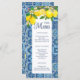 Modern and elegant white and blue menu card. The design features a pair of lemons with leafy stems and a Mediterranean tile background. Customise it easily with your wedding details.