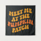 This design features the phrase "Meet Me at the Pumpkin Patch" displayed in a bold, retro-inspired font with a playful, wavy appearance. The text is arranged in a staggered, diagonal layout, adding a dynamic and lively feel to the design. The colour scheme includes warm autumnal hues, with the top words in a golden yellow transitioning to a rich orange towards the bottom, creating a gradient effect that enhances the festive fall theme.