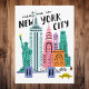 Take a bite out of the Big Apple with this vibrant 'Meet Me in New York City' postcard, featuring a delightful collection of NYC icons in a fun doodle style! This whimsical illustrated postcard captures the bustling energy of the city that never sleeps, showcasing everything from the majestic Statue of Liberty and towering skyscrapers to classic yellow taxi cabs and a charming city bridge. The playful illustrations and clear lettering make this postcard a unique and memorable tribute to New York City, USA.