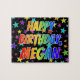 This vibrant and exciting birthday-themed jigsaw puzzle design has the message "HAPPY BIRTHDAY, MEGAN" with the characters having a colourful rainbow spectrum inspired gradient pattern, in addition to a lively field of stars background pattern. An exciting puzzle like this might be a fun way to acknowledge the birthday of somebody named Megan. [~Z0000468]