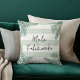 Island chic holiday pillow in beachy pale green and white stripes features the Hawaiian Christmas greeting "Mele Kalikimaka" in hand lettered script typography, accented by green watercolor palm fronds.