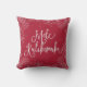 Island chic holiday pillow in festive red features the Hawaiian Christmas greeting "Mele Kalikimaka" in hand lettered script typography, surrounded by a border of white snowflakes.