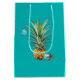 Hawaiian Christmas pineapple medium size paper gift bag. Bright aqua blue bags with single pineapple hung with a blue ornament. Another little ornament and sea star are part of the design. Add your choice of greeting at the top in green. Sample wording is, “Mele Kalikimaka” which is Hawaiian for “Merry Christmas”. This design will work for most bag sizes, but the text may not.