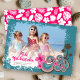 'Mele Kalikimaka' (Merry Christmas in Hawaiian), Bright Fuchsia Hot Pink Hibiscus Flowers And Tropical Palm Trees With Blue Grey Swirly Spiral Ocean Waves And A Blue Grunge Frame, Photo Christmas / Holiday Card.