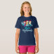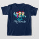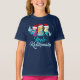 Mele Kalikimaka Mermaid Kids T-Shirt. A cute Hawaiian Merry Christmas tee featuring 3 pretty mermaids wearing Santa hats and green bikinis above the ocean blue print. A beautiful beach themed holiday gift for a girl who loves Hawaii.