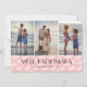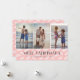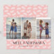 Modern pink photo Mele Kalikimaka holiday card featuring a photo collage and a pretty palm leaves pattern background.