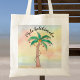 This Mele Kalikimaka Tote Bag is decorated with a hand painted palm tree decorated with lights and baubles on a watercolor background.