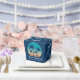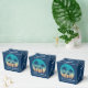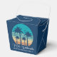 This cute Hawaiian Christmas party favour box features a tropical beach sunset on a cool blue background with a drawing of coastal palm trees against a seaside sunset. Mele Kalikimaka written in cursive typography on this pretty family holiday gift box.