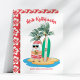 Beach theme Christmas card features Santa sipping from a pineapple, with a surfboard and palm trees on a tropical island, and the Hawaiian "Mele Kalikimaka" (Merry Christmas) holiday greeting. Reverse side is a red background with white hibiscus flowers that matches Santa's Hawaiian shorts. Original artwork KL Stock.
