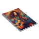 This vibrant and dynamic illustration depicts a person playing an acoustic guitar. The image is rich in colour, with swirling patterns and abstract shapes that create a sense of movement and energy. The person’s long hair flows wildly, adding to the dynamic feel of the artwork. The background is a blend of warm and cool tones, with splashes of colour that enhance the overall lively atmosphere. The detailed depiction of the guitar and the expressive use of colours make this image captivating and visually engaging.
