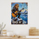 This captivating painting features a lion, exuding cool confidence in sunglasses and a leather jacket, delivering "fiery riffs" on an electric guitar. It's set on a melting, snow-covered mountain, overlooking a vibrant blue lake with hints of green foliage. The bold, textured brushstrokes give a sense of dynamic energy to both the landscape and the "Rock or Die" musical performance.