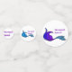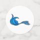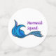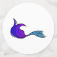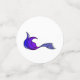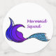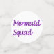 Different mermaid tails in purple and blue and the words Mermaid Squad in purple on two sided table confetti of different sizes.