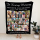 Elegant black memorial blanket celebrating the life and times of a deceased loved one featuring "In Loving Memory" in a stylish white script, a thirty photo collage to commemorate their family, pets, friends, achievements, travels and joys, their name and birth and death dates. Personalise words of memorial at the bottom (initially set to "Your life was a blessing, your memory a treasure. You are loved beyond words and missed beyond measure").