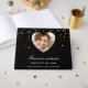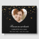 A classic black background with golden hearts. With the text: Forever in our hearts, written with an elegant hand lettered style script. Add a name and dates, a photo inside the heart shaped frame. Use a square photo for best result.