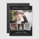 A simple and elegant memorial photo magnet. A black background, white frames. Personalise and add 4 photo and details. Text: forever in our hearts.