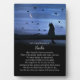 Change the name on this beautiful memorial plaque and make a lasting tribute to a beloved cat. How beautiful heaven is, because of all the animal souls and spirits. A spiritual poem by Stephanie Laird. A cute cat, silhouetted on a fence looking into the stars and moon with birds. A beautiful remembrance for your beloved kitty.