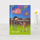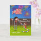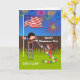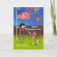 Memorial Day for a Couple, paper greeting card with text areas to add the names. A couple is hanging up patriotic bunting on a fence as fireworks explode in the sky. Customise the text on the fence for Independence Day if you like. Art, image, and verse copyright © Shoaff Ballanger Studios, 2022.