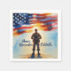 A patriotic design featuring a bold American flag waving behind the silhouette of a soldier standing at attention. Red poppies bloom at the base, symbolising remembrance and sacrifice. The phrase “Land of the Free, Because of the Brave” arches above in vintage-style lettering, evoking honour, gratitude, and national pride. Perfect for Memorial Day gatherings, parades, or as a heartfelt tribute to those who served.