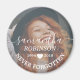 Custom memorial funeral favor magnet featuring a photo of the person being remembering, their name, birth and death dates, a sweet white heart, and the words "never forgotten".