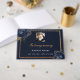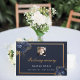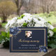 A guest book for a memorial service or funeral. A dark blue background decorated with blue florals and a faux gold frame on the front. Personalise and add a photo, name and dates.