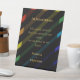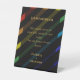 Honor loved ones who cannot be present with this heartfelt gay wedding In Memoriam table display sign. Bold diagonal rainbow stripes on black with elegant gold typography frame your personal tribute message beautifully. Fully customizable with the grooms' names and your heartfelt message remembering cherished family and friends. The dignified design displays prominently on a memorial table or at your ceremony entrance. Coordinates respectfully with our complete Gay Men Wedding Collection. Ideal for contemporary LGBTQ celebrations seeking meaningful, personalized wedding signage that celebrates those dearly missed.
