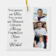 Ordered this for our daughter as a special remembrance of her father. It turned out beautifully. The only negative is that of course the pictures are pretty small but very sharp and clear. Arrived on time as promised which was great as it was meant for Christmas. I looked at a lot of different ornaments and this conveyed the right message and pictures, it is double sided so that is also nice. It was very easy to personalize and put together and looks exactly like the mockup. Very pleased with the whole experience. The script and message were excellent; very classy