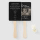 Black funeral program order of service double-sided simple in our hearts forever ceremony program fans. Simple yet elegant style program fan ideal for a summer memorial service to keep your guests cool informed and give them a keepsake of person whom they are remembering. Simply replace sample text and photo holder with your own special photo and funeral service information details. Original typography and in our hearts forever graphic design by Sarah Trett. www.sarahtrett.com for www.mylittleeden.com (Photo credit by Guilherme Stecanella on Unsplash model photo is just a placeholder image for you to replace).