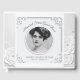 A simple, elegant, classic white frame design for a classy, personalised memorial service or other commemorative events. Paper cutout style with matching roses and pearl illustration at the back. Replace the sample portrait photo and text with your own.
