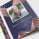 Celebrate the enduring spirit of your loved one's life with our heartfelt Celebration of Life Folding Funeral Card, a tribute adorned with the iconic symbol of the American flag. As the stars and stripes gracefully drape across the front cover, alongside a cherished photo of your beloved, this card stands as a testament to their unwavering patriotism and profound impact on those they held dear.
