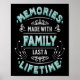 Retro style grunge "Memories made with family last a lifetime" text design with blue and white letters and floral decoration