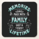 Retro style grunge "Memories made with family last a lifetime" text design with blue and white letters and floral decoration
