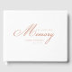 Customer specific, memorial, elegant, simpel "In Loving memory" soft-brown-orange handwriting font, white funeral guest book. Availible in different colours and sizes.