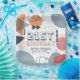 Retro 80s geometric Memphis style 21st birthday party paper plates in blue orange grey pink colours. Gender neutral birthday paper plate with easily editable template for text.