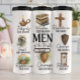 This illustrative collage titled "MEN of the Bible" showcases virtues associated with biblical figures. It features images like a lit oil lamp labelled "Integrity LIKE JOSEPH," stacked books "Wisdom LIKE SOLOMON," a wooden cross "Repentance LIKE DAVID," a ram "Trust LIKE ABRAHAM," Noah's Ark "Righteousness LIKE NOAH," shields "Courage LIKE JOSHUA," and an hourglass "Patience LIKE JOB." Each element is presented with a vintage, slightly textured aesthetic