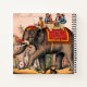 Vintage print of men performing a circus act with an elephant. One man is riding on the tusks, another is lying beneath the animal.