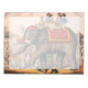 Vintage print of men performing a circus act with an elephant. One man is riding on the tusks, another is lying beneath the animal.