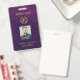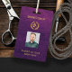 Custom identification barber salon employee photo badge on an elegant purple leather look background with faux gold scissors and laurel wreath logo and typography script. ++++++++++ Easy to personalise with your business name, logo, employee photo, name and title and your text on the backside. +++++++++++++ Suitable for elegant luxury men barber hairstyle grooming salon, men store or any other elegant professional exclusive businesses.