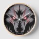 This image features a menacing, wolf-like creature with sharp, glowing red eyes and a fierce expression. The creature's face is partially obscured by a series of deep red scratches or claw marks, and its fur appears textured with a mix of dark and light shades. The background is predominantly black with splatters of red, adding to the overall ominous vibe.