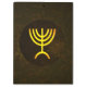 A brown and gold digital rendering of the Jewish seven-branched menorah (Hebrew: מְנוֹרָה). The seven-branched menorah, used in the portable sanctuary set up by Moses in the wilderness and later in the Temple in Jerusalem, has been a symbol of Judaism since ancient times and is the emblem on the coat of arms of the modern state of Israel. The kohanim lit the menorah in the Sanctuary every evening and cleaned it out every morning, replacing the wicks and putting fresh olive oil into the cups. It has been said that the menorah is a symbol of the nation of Israel and our mission to be "a light unto the nations." (Isaiah 42:6). Our sages emphasize that light is not a violent force; Israel is to accomplish its mission by setting an example, not by using force. This idea is highlighted in the vision in Zechariah 4:1-6. Zechariah sees a menorah, and G-d explains: "Not by might, nor by power, but by My spirit." G-d revealed the design for the menorah to Moses as follows (Exodus 25:31-40): 31 And you must make a lampstand of pure gold. Of hammered work the lampstand is to be made. Its base, its branches, its cups, its knobs and its blossoms are to proceed out from it. 32 And six branches are running out from its sides, three branches of the lampstand from its one side and three branches of the lampstand from its other side. 33 Three cups shaped like flowers of almond are on the one set of branches, with knobs and blossoms alternating, and three cups shaped like flowers of almond on the other set of branches, with knobs and blossoms alternating. This is the way it is with the six branches running out from the lampstand. 34 And on the lampstand are four cups shaped like flowers of almond, with its knobs and its blossoms alternating. 35 And the knob under two branches is out of it and the knob under the two other branches is out of it and the knob under two more branches is out of it, for the six branches running out from the lampstand. 36 Their knobs and their branches are to proceed out from it. All of it is one piece of hammered work, of pure gold. 37 And you must make seven lamps for it; and the lamps must be lit up, and they must shine upon the area in front of it. 38 And its snuffers and its fire holders are of pure gold. 39 Of a talent of pure gold he should make it with all these utensils of it. 40 And see that you make them after their pern that was shown to you in the mountain. Until 2009, the earliest preserved representation of the menorah of the Temple was depicted in a frieze on the Arch of Titus, commemorating his triumphal parade in Rome following the destruction of Jerusalem in the year 70. In 2009, however, the ruins of a synagogue with pottery dating from before the destruction of the Second Temple were dised under land in Magdala owned by the Legionaries of Christ, who had intended to construct a centre for women's studies. Inside that synagogue's ruins was discovered a rectangular stone, which had on its surface, among other ornate carvings, a depiction of the seven-branched menorah differing markedly from the depiction on the Arch of Titus, probably carved by an eyewitness to the actual menorah present at the time in the Temple at Jerusalem. This menorah has arms which are polygonal, not rounded, and the base is not graduated but triangular. Representations of the seven branched artefact have been found on tombs and monuments dating from the 1st century as a frequently used symbol of Judaism and the Jewish people. Contrary to some modern designs, the ancient menorah did not contain anything resembling seven candles as they did not exist then.