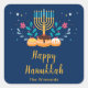 Hanukkah party sticker with a menorah and sufganiyots. The words can be changed to suit your own details or requirements