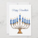 Watercolor menorah with blue burning candles on front and Star of David on back. Happy Hanukkah and greeting on back can be changed. AI assisted graphic purchased with commercial use. Artwork: CosmicMeta