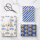 Great for celebrating Hanukkah season, this design features our original menorah vector graphic with script text calligraphy, "Happy Hanukkah" greeting on the 1st sheet, a simple blue and white striped pattern on the 2nd sheet and a gold tone Star of David pattern on a blue background on the 3rd sheet. Composite design by Holiday Hearts Designs (rights reserved).