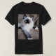 A sleek T-shirt design featuring a playful Siamese cat with piercing blue eyes, surrounded by minimalist geometric patterns and soft pastel colours, emphasizing elegance, charm, and feline grace.
