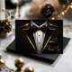 Mens black and gold thank you cards with black and gold tuxedo, bow tie and pocket square. These black and gold thank you cards are easily personalised by adding your printed message on the inside, or leave blank for your hand written message. These tuxedo thank you cards are great for corporate events, retirements, bachelor parties and any black tie formal event. Ad your text, logo, images, etc., to personalise.