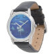 Mens classic black leather strap watch shown with a photo print of sharks in the deep sea. Choose this watch from several styles. Customise this watch or buy as is. Stock Image