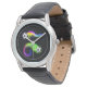 Men's classic leather strap watch shown in black with a sporty flaming soccer balls print.