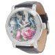 This men's watch is shown with a cute farm cow and pink peony flowers art print.