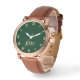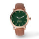 Create your own custom, personalised, elegant faux gold monogrammed on dark forest green dial, stylish cool unique classy mens rose gold retro vintage classic look style brown leather strap watch. Simply type in your name / monogram / initials, to customise. Makes a great gift, for birthday, graduation, fathers day, christmas, holidays, wedding, marriage anniversary, valentines day, and more, for your loved ones, brother, son, dad, husband, boyfriend, groom, groomsmen, best man, grandpa, family and friends.
