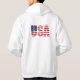 Men's pullover hoodie is shown in white with a USA Flag graphic print on the back, perfect for July 4th holiday or any other patriotic moment, this hoodie is made of quality materials and craftsmanship and is available in more colours.