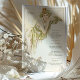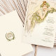 This exquisite wedding dinner menu features a stunning Art Nouveau design inspired by the works of Alphonse Mucha. The front of the menu showcases a graceful illustration of a woman presenting a dish, framed by soft earth tones of vintage green, ivory, and golden accents. The intricate details of the illustration reflect the elegance and timeless beauty of the Art Nouveau era. Perfect for couples who want to add a touch of classical artistry to their wedding, this menu offers a sophisticated presentation of your special dinner. The back features a simple yet elegant design with a nature-inspired emblem, complementing the overall vintage aesthetic.